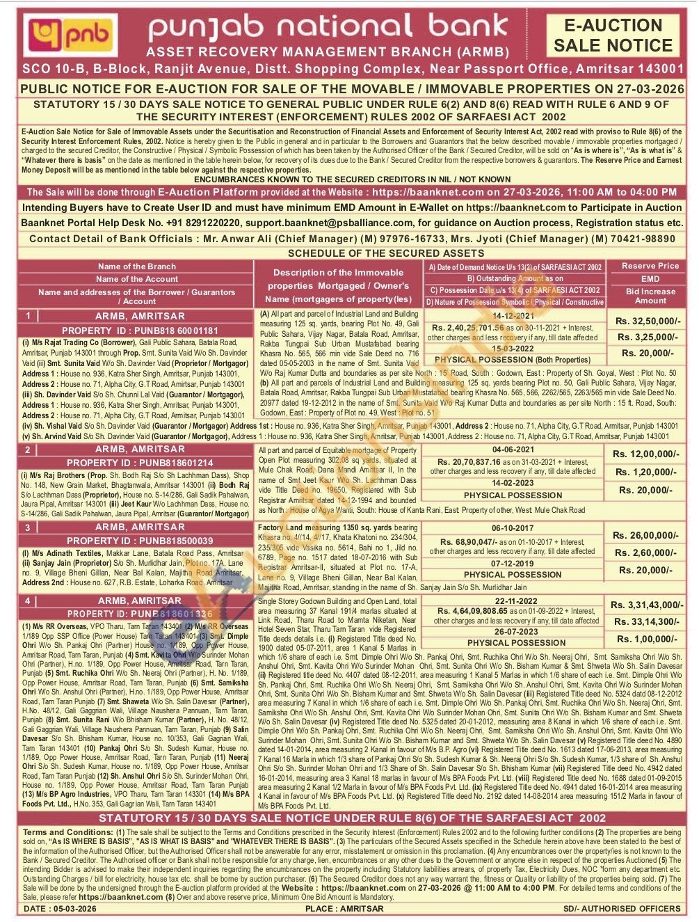 (A) All part and parcel of Industrial Land and Building measuring 125 sq. yards, bearing Plot No. 49, Gali Public Sahara, Vijay Nagar, Batala Road, Amritsar, Rakba Tungpai Sub Urban Mustafabad bearing Khasra No. 565, 566 min vide Sale Deed no. 716 dated 05-05-2003 in the name of Smt. Sunita Vaid W/o Raj Kumar Dutta and boundaries as per site North: 15 Road, South Godown, East: Property of Sh. Goyal, West: Plot No. 50 (b) All part and parcels of Industrial Land and Building measuring 125 sq. yards bearing Plot no. 50, Gali Public Sahara, Vijay Nagar, Batala Road, Amritsar, Rakba Tungpai Sub Urban Mustafabad bearing Khasra No. 565, 566, 2262/565, 2263/565 min vide Sale Deed No. 20977 dated 19-12-2012 in the name of Smt. Sunita Vaid W/o Raj Kumar Dutta and boundaries as per site North: 15 ft. Road, South:Godown, East: Property of Plot no. 49, West: Plot no. 51