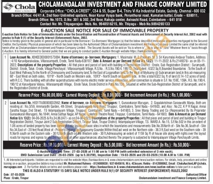Descriptions of the property/Properties: All that piece and parcel of land and building in Tirupur Registration District, Tirupur Joint 2 Sub Registration District, Tirupur Taluk, Tirupur District, Velampalayam Village, T.S. WARD A. No.15, S.F.No.502 in this an extent of 1.06 acres of landed property has been converted into layout of house sites in which the boundaries and measurements Site. No. 35 North of Site. No. 36, South of - Site No.34, East of 20 feet Road, West of-Property belongs to Rangasamy Gounder, Within this East west on the Northern side-38.3 ft, East west on the Southem side-39 ft, North south on the Eastern side-30 ft, North south on the Western side 30 ft, Admeasuring an extent of 1159 Sq Ft of house site along with rights over the layout roads for ingress and egress to use the roads and all other appurtenances attached thereto The property is subjected to Velampalayam Village Panchayath Limits