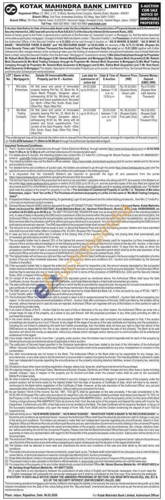 All that piece and parcel of immovable property bearing Plot No. 23. Block No. A, Gaun Mandi Prangan, Sanganer, Jaipur, admeasuring 92.94 Sq. Mir. along with all present and future superstructure. Four corners of the Said Property:-North-Other Plot, South Road, East- Other Plot, West-Other Plat