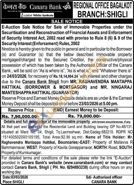 All that part and parcel of the Residential Land and Building bearing GP No.48/131. situated at Ward No. 04, Shigli, Tq:Laxmeshwar, Dist: Gadag-582210. RDPR NO 151400502000105195, Total Area:92.90 sq.mtr. Name of Title Holder: Mr. Raghavendra Mantappa Hattikal, Boundaries:-EAST: Property of Mallavva R Bammannavar, WEST: Property of Kavita Goneppanavar, NORTH: Road, SOUTH: Property of Kumkumagar.