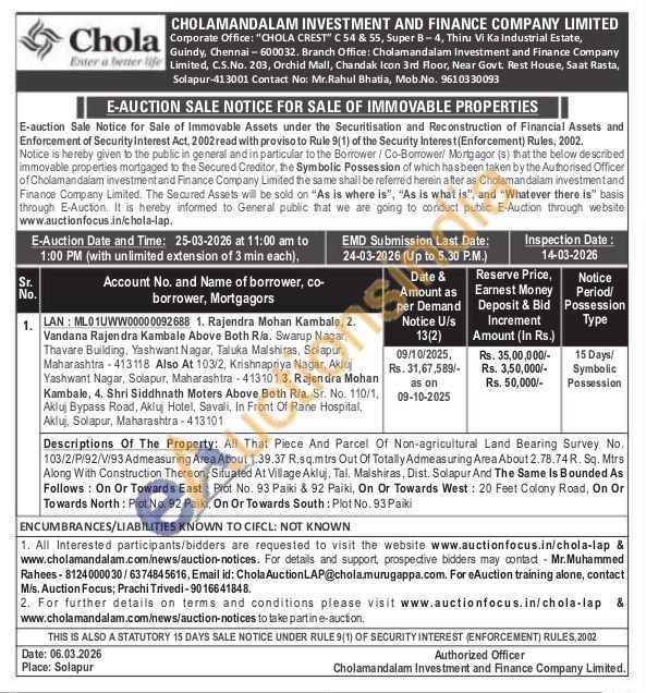 Descriptions Of The Property: All That Piece And Parcel Of Non-agricultural Land Bearing Survey No. 103/2/P/92/V/93 Admeasuring Area About 1.39.37 R.sq.mtrs Out Of Totally Admeasuring Area About 2.78.74 R. Sq. Mtrs Along With Construction Thereon, Situated At Village Akluj, Tal. Malshiras, Dist. Solapur And The Same Is Bounded As Follows: On Or Towards East: Plot No. 93 Paiki & 92 Paiki, On Or Towards West: 20 Feet Colony Road, On Or Towards North: Plot No. 92 Paiki, On Or Towards South: Plot No. 93 Paiki