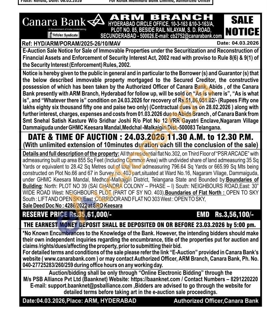 Details and full description of the property: All that residential flat No.302, on Third Floor of "PSRARCADE" with admeasuring built up area 855 Sq Feet (Including Common Area) with undivided share of land admeasuring 35 Sq Yards or equivalent to 28.42 Sq Metres out of total land admeasuring 796.64 Sq Yards or 665.99 Sq Mts being constructed on Plot No.66 and 67 in Survey no. 403 part, situated at Ward No.16, Nagaram Vilage, Dammaiguda, under GHMC Keesara Mandal, Medhcal-Malkajgiri District, Telangana State and Bounded by:Boundaries of Building: North: PLOT NO 39 (SAI CHANDRA COLONY - PHASE - I) South: NEIGHBOURS ROAD, East: 30" WIDE ROAD West: NEIGHBOURS PLOT (PART OF SY NO. 403), Boundaries of Flat North: OPEN TO SKY South: LIFT AND OPEN SKY East: CORRIDOR AND FLAT NO 303 West: OPEN TO SKY