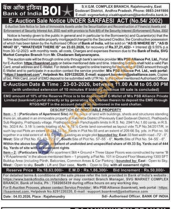 Item-1: (Particulars of Apartment Site) All the piece of land with buildings, sheds and structures standing there on, situated in an immovable property in Kakinada District (Previously East Godavari District), Prathipadu Sub Registry, Prathipadu village, Prathipadu Gram Panchayathi limits In R.S. No. 294/1 Ac. 1.60 cents, in R.S. No. 302/4 Ac. 3.18% cents totaling of Ac. 4-78% Cents land converted as layout vide TLP No. 34/2017/R, in such lay-out Plots an extent of 234.33 Sq. Yards in Plot No. 55 and an extent of 209.66 Sq. yds. in Plot no. 56 together in a total extent of 444 Sq. Yds. Existing as single plot bounded by: East:33 feet width road-72-0 West: Site of Plot No. 62, 63-72-0, South: Site of Plot No. 57-55-6, North: Site of Plot No. 54-55-6" Within the above boundaries an extent of undivided and unspecified share of 49.33 Sq. Yards out of 444 Sq. Yards of site with all easement rights Item-2: (Particulars of Flat) An apartment Stilt + Ground + Three Upper Floors was constructed by name "B VRApartments" in the above mentioned Item-1 property, a Flat No. 101 in Ground Floor Measuring 1300 SFT Buildup Area (including Plinth, Balconies, Common Areas & Car Parking) bounded by: East: Open to Sky. West: Open to sky, South: Lift and Stair case, North: Open to Sky with all easement rights