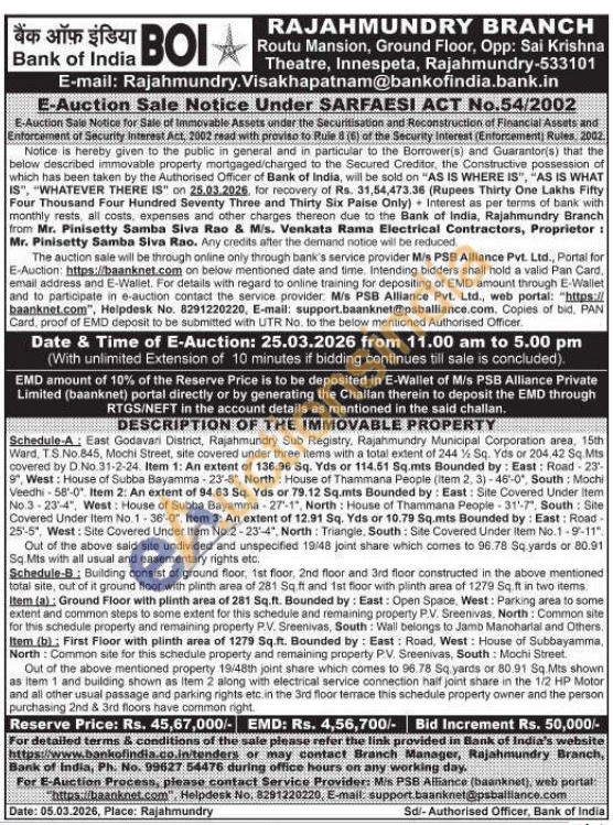 Schedule-A: East Godavari District, Rajahmundry Sub Registry, Rajahmundry Municipal Corporation area, 15th Ward, T.S.No.845, Mochi Street, site covered under three items with a total extent of 244 ½ Sq. Yds or 204,42 Sq Mts covered by D. No. 31-2-24. Item 1: An extent of 136.96 Sq. Yds or 114.51 Sq.mts Bounded by: East: Road-23-9", West: House of Subba Bayamma-23-8, North House of Thammana People (item 2. 3)-46-0, South: Mochi Veedhi-58-0 Item 2: An extent of 94.63 Sq. Yds or 79.12 Sq.mts Bounded by: East: Site Covered Under Item No.3-23-4", West: House of Subba Bayamma 27-1", North House of Thammana People-31-7", South: Site Covered Under Item No. 1-36-0. Item 3: An extent of 12.91 Sq. Yds or 10.79 Sq.mts Bounded by: East: Road-25-5", West: Site Covered Under Item No.2-23-4", North: Triangle, South: Site Covered Under Item No.1-9-11" Out of the above said site undivided and unspecified 19/48 joint share which comes to 96.78 Sq yards or 80.91 Sq. Mts with all usual and easementary rights etc. Schedule-B: Building consist of ground floor, 1st floor, 2nd floor and 3rd floor constructed in the above mentioned total site, out of it ground floor with plinth area of 281 Sq ft and 1st floor with plinth area of 1279 Sq ft in two items Item (a): Ground Floor with plinth area of 281 Sq.ft. Bounded by: East: Open Space, West: Parking area to some extent and common steps to some extent for this schedule and remaining property P.V. Sreenivas, North: Common site for this schedule property and remaining property PV. Sreenivas, South: Wall belongs to Jamb Manoharlal and Others Item (b); First Floor with plinth area of 1279 Sq.ft. Bounded by: East: Road, West: House of Subbayamma, North: Common site for this schedule property and remaining property P.V. Sreenivas, South Mochi Street Out of the above mentioned property 19/48th joint share which comes to 98.78 Sq yards or 80.91 Sq.Mts shown as Item 1 and building shown as Item 2 along with electrical service connection half joint share in the 1/2 HP Motor and all other usual passage and parking rights etc. in the 3rd floor terrace this schedule property owner and the person purchasing 2nd & 3rd floors have common right