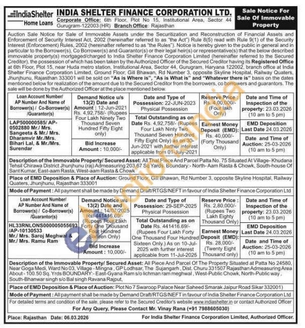 Description of the Immovable Property/Secured Asset: All That Piece And Parcel Patta No. 75 Situated At Village-Khudana Tehsil Chirawa District Jhunjhunu (raj) Admeasuring 203.67 Sq Yards. Boundary:-North-Aam Rasta & Chowk, South-house Of Sant Kumar, East-aam Rasta, West-aam Rasta & Chowk