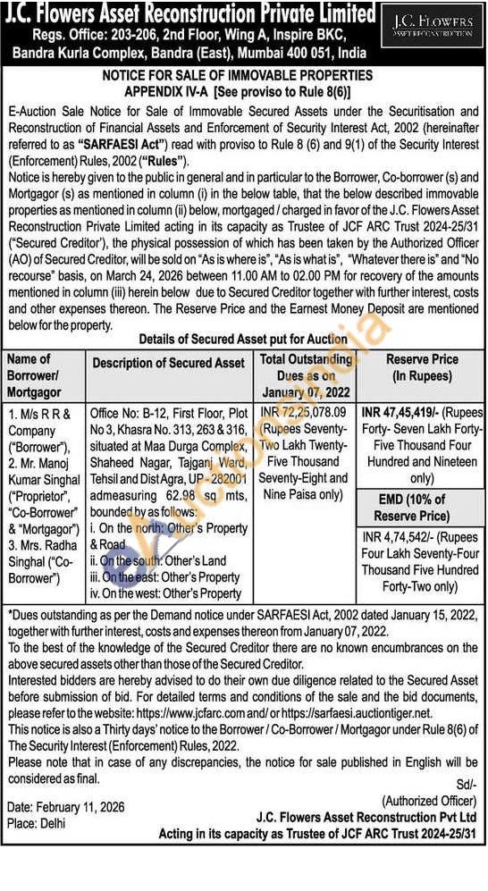 Office No: B-12, First Floor, Plot No 3, Khasra No. 313, 263 & 316, situated at Maa Durga Complex, Shaheed Nagar, Tajganj Ward, Tehsil and Dist Agra, UP-282001 admeasuring 62.98 sq mts