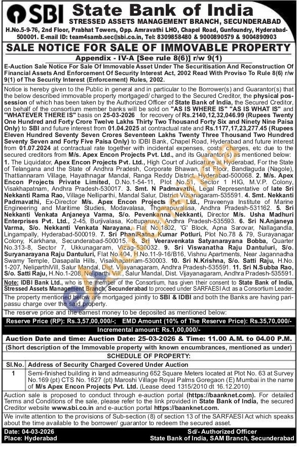 Semi-finished building in land admeasuring 652 Square Meters located at Plot No. 63 at Survey No. 169 (pt) CTS No. 1627 (pt) Maroshi Village Royal Palms Goregaon (E) Mumbai in the name of M/s Apex Encon Projects Pvt. Ltd. (Lease deed 1315/2010 dt 16.12.2010)