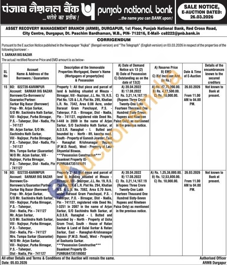 All that piece and parcel of land & building situated at Mouza Birnagar, Vill-Nazirpur, J.L. No. 19, R.S. Plot No. 124 & L.R. Plot No. 294, Khatian R.S. & L.R. No. 7082, Area 0.70 Acre, under Barasat Gram Panchayat, P.S. Taherpur, P.O. Birnagar, Dist-Nadia, Pin-741127, registered vide Deed No. 1-3251 in 2007 in the name of Arjun Sarkar, S/O Sachindra Nath Sarkar, at A.D.S.R. Ranaghat 1. Butted and Property of Usha House of Ratan bounded by North Gram Trust, South Sarkar & Land of Dulal Sarkar & Ratan Sarkar, East Ranaghat-Krishnanagar Bypass (P.W.D. Road), West - Property of Sushanta Sarkar.