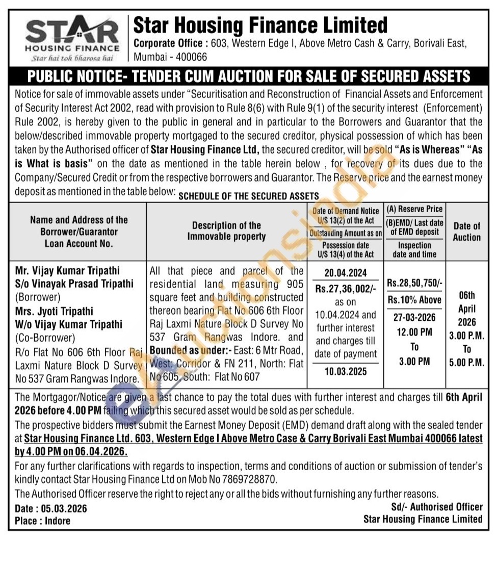 All that piece and parcel of the residential land measuring 905 square feet and building constructed thereon bearing Flat No 606 6th Floor Raj Laxmi Nature Block D Survey No 537 Gram Rangwas Indore. and Bounded as under:- East: 6 Mtr Road, West: Corridor & FN 211, North: Flat No 605, South: Flat No 607