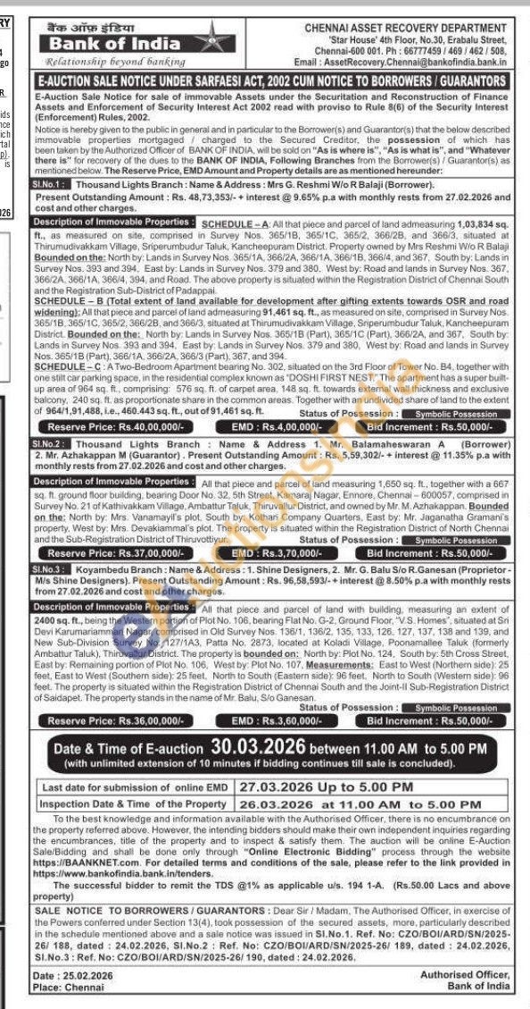 Contact no : 66777459/469/462/508 Email: AssetRecovery Chennai bankofindia.bank.in