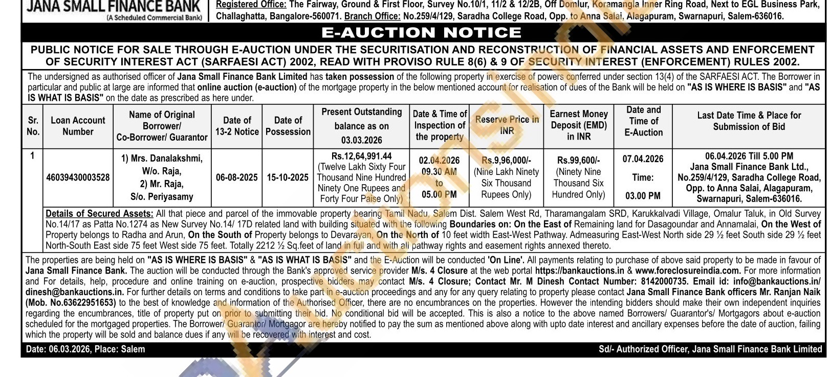 Details of Secured Assets: All that piece and parcel of the immovable property bearing Tamil Nadu, Salem Dist. Salem West Rd, Tharamangalam SRD, Karukkalvadi Village, Omalur Taluk, in Old Survey No.14/17 as Patta No. 1274 as New Survey No. 14/ 17D related land with building situated with the following Boundaries on: On the East of Remaining land for Dasagoundar and Annamalai, On the West of Property belongs to Radha and Arun, On the South of Property belongs to Devarayan, On the North of 10 feet width East-West Pathway, Admeasuring East-West North side 29½ feet South side 29% feet North-South East side 75 feet West side 75 feet. Totally 2212½ Sq.feet of land in full and with all pathway rights and easement rights annexed thereto.