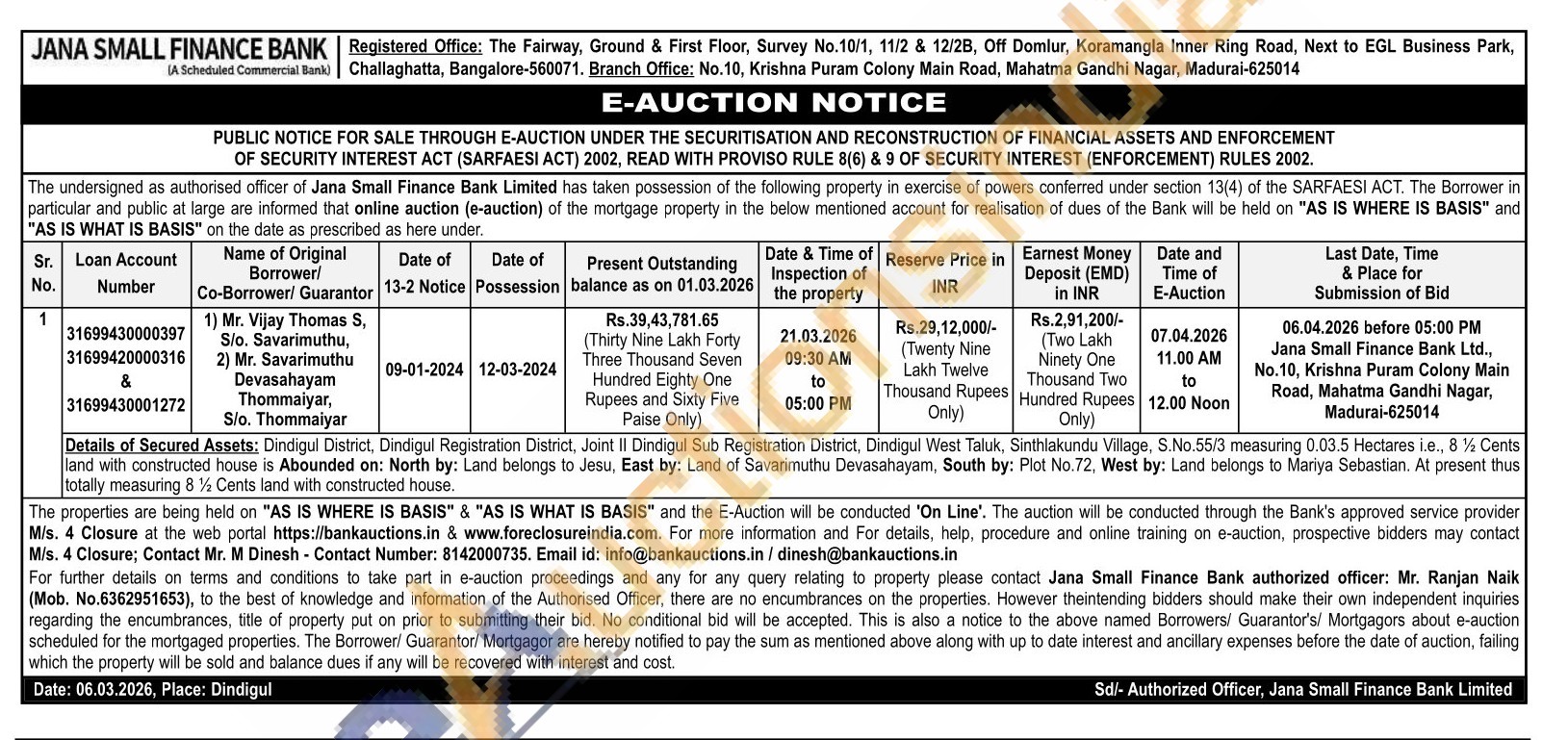 Details of Secured Assets; Dindigul District, Dindigul Registration District, Joint II Dindigul Sub Registration District, Dindigul West Taluk, Sinthlakundu Village, S.No.55/3 measuring 0.03.5 Hectares i.e., 8% Cents land with constructed house is Abounded on: North by: Land belongs to Jesu, East by: Land of Savarimuthu Devasahayam, South by: Plot No.72, West by: Land belongs to Mariya Sebastian. At present thus totally measuring 8% Cents land with constructed house.