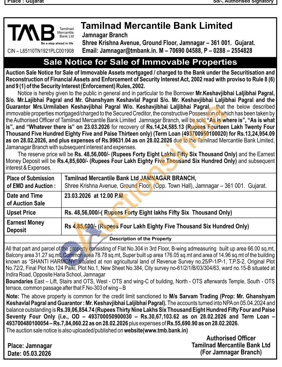 All that part and parcel of the property consisting of Flat No.304 in 3rd Floor, B-wing admeasuring built up area 66.00 sq.mt, Balcony area 31.27 sq.mt, Common area 78.78 sq.mt, Super built up area 176.05 sq.mt and area of 14.96 sq.mt of the building known as "SHANTI HARMONY" situated at non agricultural land of Revenue Survey no.25/P-1/P-1, T.P.S-2, Original Plot No.72/2, Final Plot No. 124 Paiki, Plot No. 1, New Sheet No.384, City survey no-61/2/1/B/03/304/63, ward no. 15-B situated at Indira Road, Opposite Haria School, Jamnagar