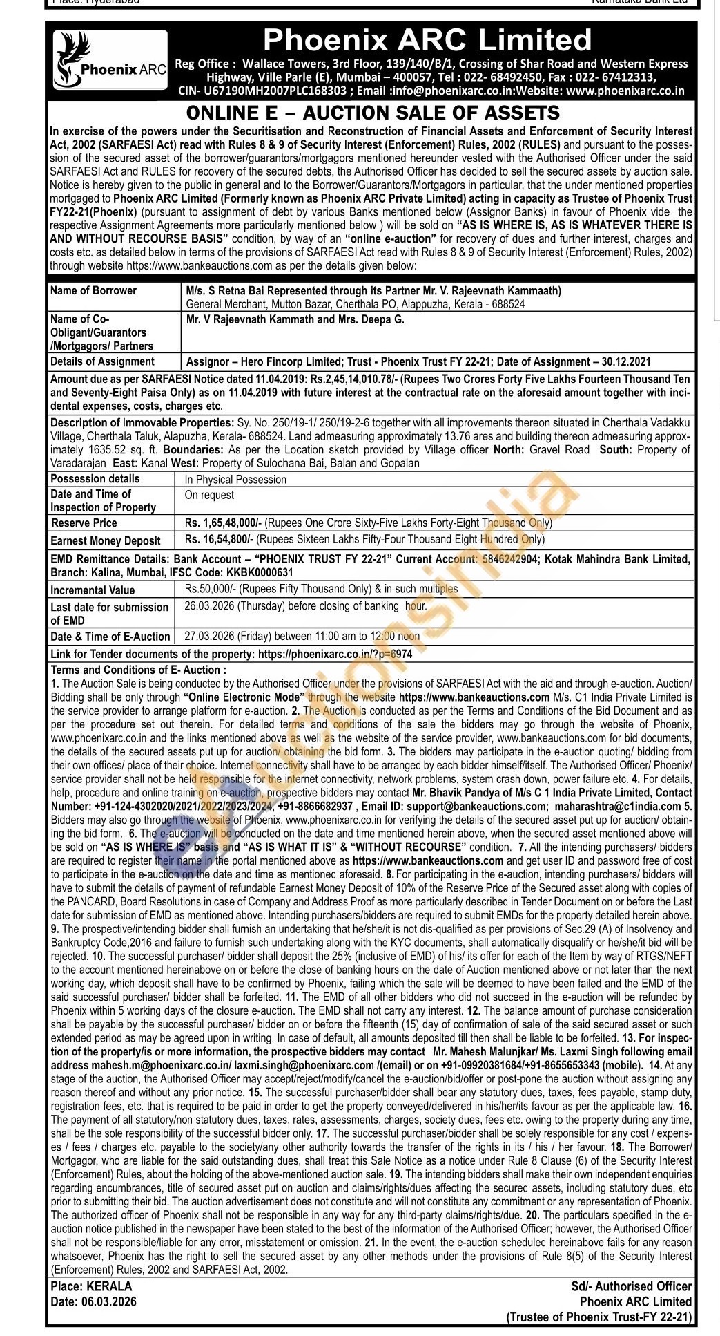 Description of Immovable Properties: Sy. No. 250/19-1/250/19-2-6 together with all improvements thereon situated in Cherthala Vadakku Village, Cherthala Taluk, Alapuzha, Kerala-688524. Land admeasuring approximately 13.76 ares and building thereon admeasuring approx-imately 1635.52 sq. ft. Boundaries: As per the Location sketch provided by Village officer North: Gravel Road South: Property of Varadarajan East: Kanal West: Property of Sulochana Bai, Balan and Gopalan