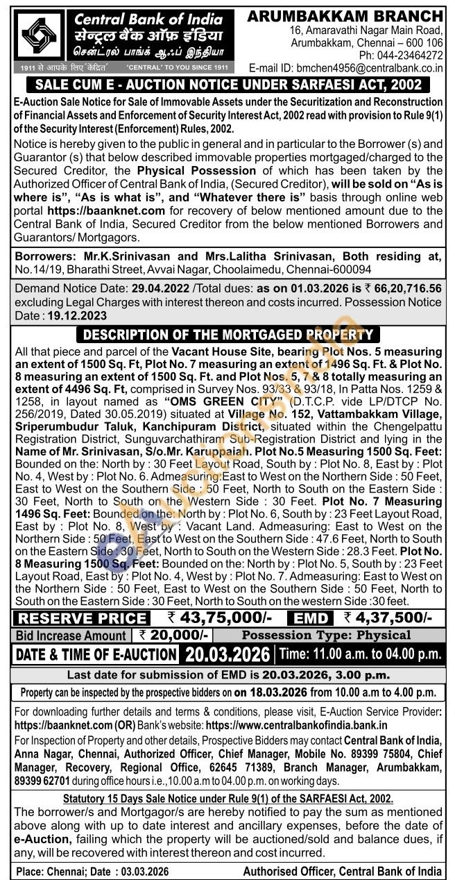 All that piece and parcel of the Vacant House Site, bearing Plot Nos. 5 measuring an extent of 1500 Sq. Ft, Plot No. 7 measuring an extent of 1496 Sq. Ft. & Plot No. 8 measuring an extent of 1500 Sq. Ft. and Plot Nos. 5, 7 & 8 totally measuring an extent of 4496 Sq. Ft, comprised in Survey Nos. 93/33 & 93/18, In Patta Nos. 1259 & 1258, in layout named as "OMS GREEN CITY" (D.T.C.P. vide LP/DTCP No. 256/2019, Dated 30.05.2019) situated at Village No. 152, Vattambakkam Village, Sriperumbudur Taluk, Kanchipuram District, situated within the Chengelpattu Registration District, Sunguvarchathiram Sub-Registration District and lying in the Name of Mr. Srinivasan, S/o.Mr. Karuppaiah. Plot No.5 Measuring 1500 Sq. Feet: Bounded on the: North by: 30 Feet Layout Road, South by: Plot No. 8, East by: Plot No. 4, West by: Plot No. 6. Admeasuring: East to West on the Northern Side: 50 Feet, East to West on the Southern Side: 50 Feet, North to South on the Eastern Side 30 Feet, North to South on the Western Side 30 Feet. Plot No. 7 Measuring 1496 Sq. Feet: Bounded on the: North by: Plot No. 6, South by: 23 Feet Layout Road, East by: Plot No. 8, West by: Vacant Land. Admeasuring: East to West on the Northern Side: 50 Feet, East to West on the Southern Side: 47.6 Feet, North to South on the Eastern Side: 30 Feet, North to South on the Western Side: 28.3 Feet. Plot No. 8 Measuring 1500 Sq. Feet: Bounded on the: North by: Plot No. 5, South by: 23 Feet Layout Road, East by: Plot No. 4, West by: Plot No. 7. Admeasuring: East to West on the Northern Side: 50 Feet, East to West on the Southern Side: 50 Feet, North to South on the Eastern Side: 30 Feet, North to South on the western Side: 30 feet.