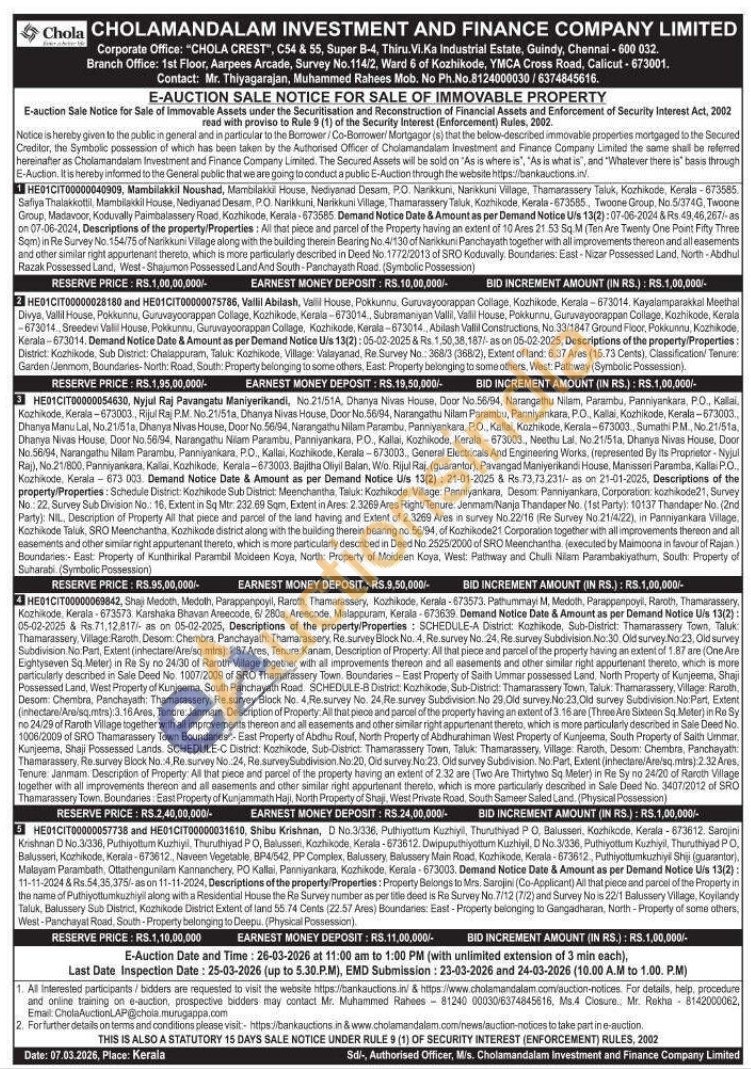 5) All that piece and parcel of the Property in the name of Puthiyottumkuzhiyil along with a Residential House the Re Survey number as per title deed is Re Survey No.7/12 (7/2) and Survey No is 22/1 Balussery Vilage, Koyilandy Taluk, Balussery Sub District, Kozhikode District Extent of land 55.74 Cents (22.57 Ares) Boundaries: East-Property belonging to Gangadharan, North-Property of some others, West-Panchayat Road, South-Property belonging to Deepu. (Physical Possession).
