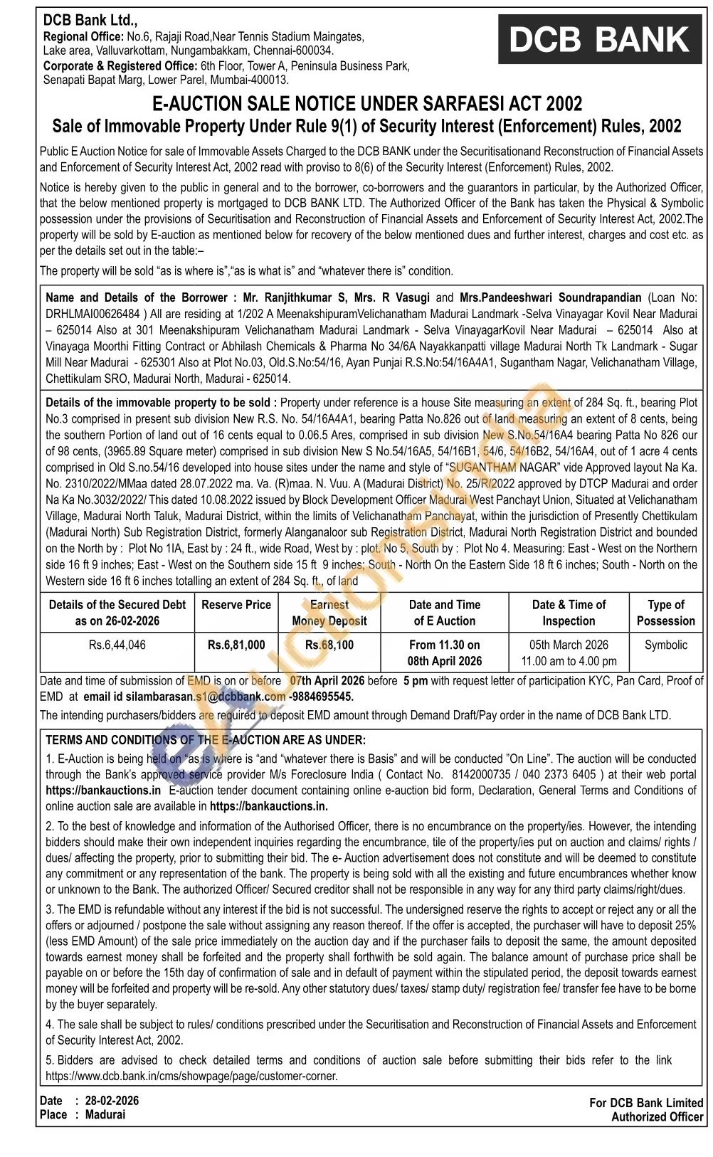 Details of the immovable property to be sold: Property under reference is a house Site measuring an extent of 284 Sq. ft., bearing Plot No.3 comprised in present sub division New R.S. No. 54/16A4A1, bearing Patta No.826 out of land measuring an extent of 8 cents, being the southern Portion of land out of 16 cents equal to 0.06.5 Ares, comprised in sub division New S.No.54/16A4 bearing Patta No 826 our of 98 cents, (3965.89 Square meter) comprised in sub division New S No.54/16A5, 54/1681, 54/6, 54/16B2, 54/16A4, out of 1 acre 4 cents comprised in Old S.no.54/16 developed into house sites under the name and style of "SUGANTHAM NAGAR" vide Approved layout Na Ka. No. 2310/2022/MMaa dated 28.07.2022 ma. Va. (R)maa. N. Vuu. A (Madurai District) No. 25/R/2022 approved by DTCP Madurai and order Na Ka No.3032/2022/ This dated 10.08.2022 issued by Block Development Officer Madurai West Panchayt Union, Situated at Velichanatham Village, Madurai North Taluk, Madurai District, within the limits of Velichanatham Panchayat, within the jurisdiction of Presently Chettikulam (Madurai North) Sub Registration District, formerly Alanganaloor sub Registration District, Madurai North Registration District and bounded on the North by: Plot No 11A. East by: 24 ft., wide Road, West by plot. No 5, South by: Plot No 4. Measuring: East-West on the Northern side 16 ft 9 inches; East-West on the Southern side 15 ft 9 inches: South - North On the Eastern Side 18 ft 6 inches; South-North on the Western side 16 ft 6 inches totalling an extent of 284 Sq. ft., of land