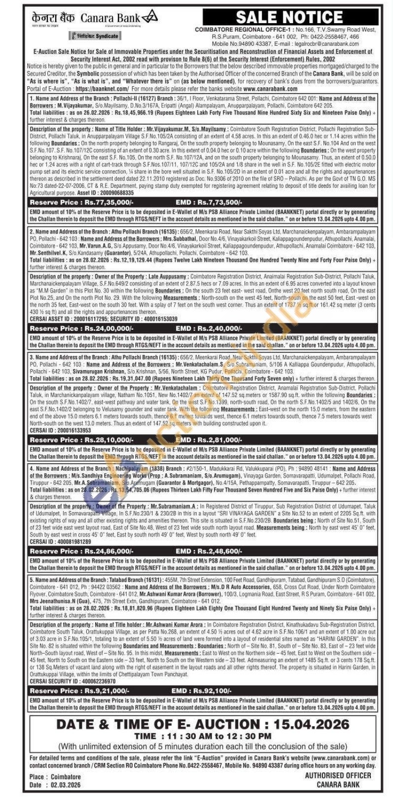 4) In Registered District of Tiruppur, Sub Registration District of Udumapet, Taluk of Udumalpet, In Somavarapatti Village, In S.F.No.230/1 & 230/2B in this in a layout "SRI VINAYAGA GARDEN" a Site No.52 to an extent of 2205 Sq.ft. with existing rights of way and all other existing rights and amenities thereon. This site is situated in S.F.No.230/28 Boundaries being: North of Site No.51, South of 23 feet wide east west layout road, East of Site No.48, West of 23 feet wide south north layout road. Measurements being: North by east west 45' 0" feet, South by east west in cross 45' 0" feet, East by south north 49' 0" feet, West by south north 49' 0" feet. CERSAI ID: 400081981289