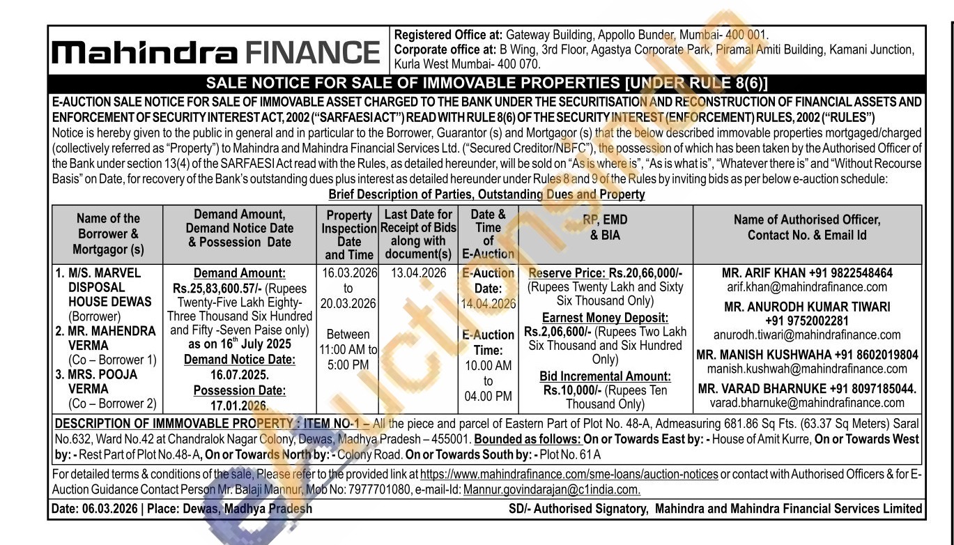 DESCRIPTION OF IMMMOVABLE PROPERTY: ITEM NO-1 - All the piece and parcel of Eastern Part of Plot No. 48-A, Admeasuring 681.86 Sq Fts. (63.37 Sq Meters) Saral No.632, Ward No.42 at Chandralok Nagar Colony, Dewas, Madhya Pradesh-455001. Bounded as follows: On or Towards East by: - House of Amit Kurre, On or Towards West by:-Rest Part of Plot No.48-A, On or Towards North by: - Colony Road. On or Towards South by: - Plot No. 61 A