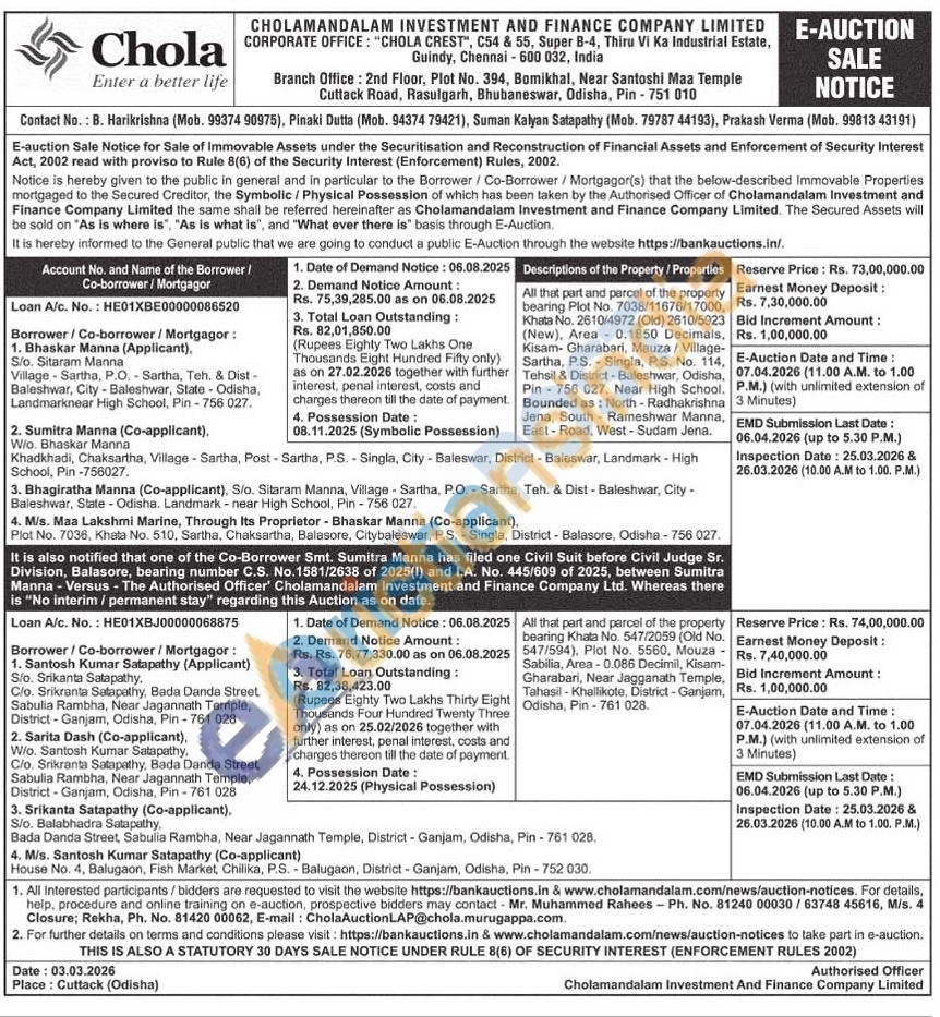 All that part and parcel of the property bearing Plot No. 7038/11676/17000, Khata No. 2610/4972 (Old) 2610/5923 (New), Area 0.1850 Decimals, Kisam- Gharabari, Mauza/Village-Sartha, P.S. - Singla, P.S. No. 114, Tehsil & District-Baleshwar, Odisha, Pin-756 027. Near High School, Bounded as: North - Radhakrishna Jena, South - Rameshwar Manna, East-Road, West - Sudam Jena.