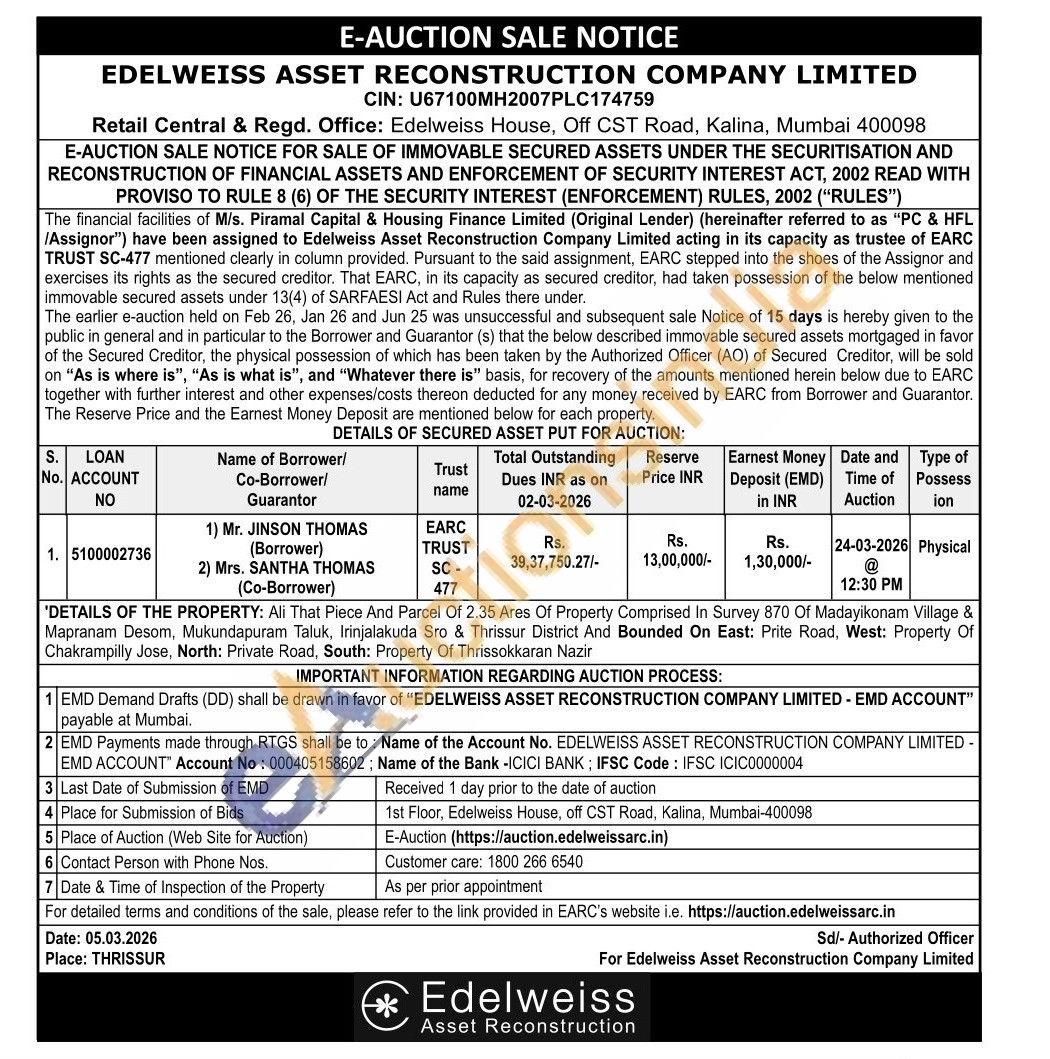 DETAILS OF THE PROPERTY: Ali That Piece And Parcel Of 2.35 Ares Of Property Comprised In Survey 870 Of Madayikonam Village & Mapranam Desom, Mukundapuram Taluk, Irinjalakuda Sro & Thrissur District And Bounded On East: Prite Road, West: Property Of Chakrampilly Jose, North: Private Road, South: Property Of Thrissokkaran Nazir