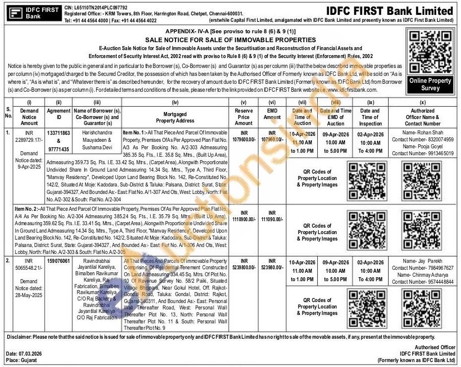 Item No. 1:-All That Piece And Parcel Of Immovable Property, Premises OfAs Per Approved Plan Flat No. A/3. As Per Booking No. A/2-303 Admeasuring 385.35 Sq. Fts., I.E. 35.8 Sq. Mtrs., (Built Up Area), : Admeasuring 359.73 Sq. Fts. I.E. 33.42 Sq. Mtrs., (Carpet Area), Alongwith Proportionate Undivided Share In Ground Land Admeasuring 14.34 Sq. Mtrs., Type A, Third Floor, "Manvay Residency", Developed Upon Land Bearing Block No. 142, Re-Constituted No. 142/2, Situated At Moje: Kadodara, Sub-District & Taluka: Palsana, District: Surat, State: Gujarat-394327, And Bounded As:- East Flat No. A/1-307 And Ots, West: Lobby, North: Flat No. A/2-302 & South: Flat No. A/2-304