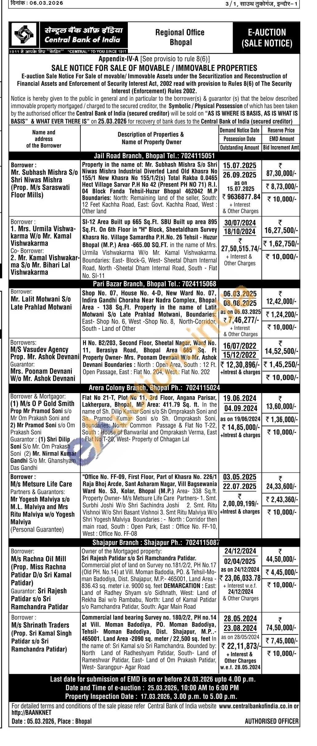 "Office No. FF-09, First Floor, Part of Khasra No. 226/1 Raja Bhoj Arcde, Sant Asharam Nagar, Vill Bagsewania Ward No. 53, Kolar, Bhopal (M.P.) Area- 338 Sq.ft. Property Owner- M/s Metsure Life Care Partners-1. Smt. Surbhi Joshi W/o Shri Sachindra Joshi 2. Smt. Ritu Vishnoi W/o Shri Basant Vishnoi 3. Smt Ritu Malviya W/o Shri Yogesh Malviya Boundaries: North Corridor then main road, South Open Park, East Office No. FF-10, West: Office No. FF-08