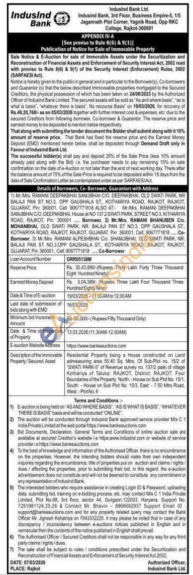 Residental Property being a House constructed on Land admeasuring area 55.40 Sq. Mrs. Of Sub-Plot no 152 of SVIATI PARK-5 of Revenue survey no. 137/2 paiki of village Kothariya of Taluka: RAJKOT, District: RAJKOT Four Boundaries of the Property North House on Sub Pict No. 15/1 South House on Sub Plot No. 153. East-7:50 Mitrs Road West-Plot No.6