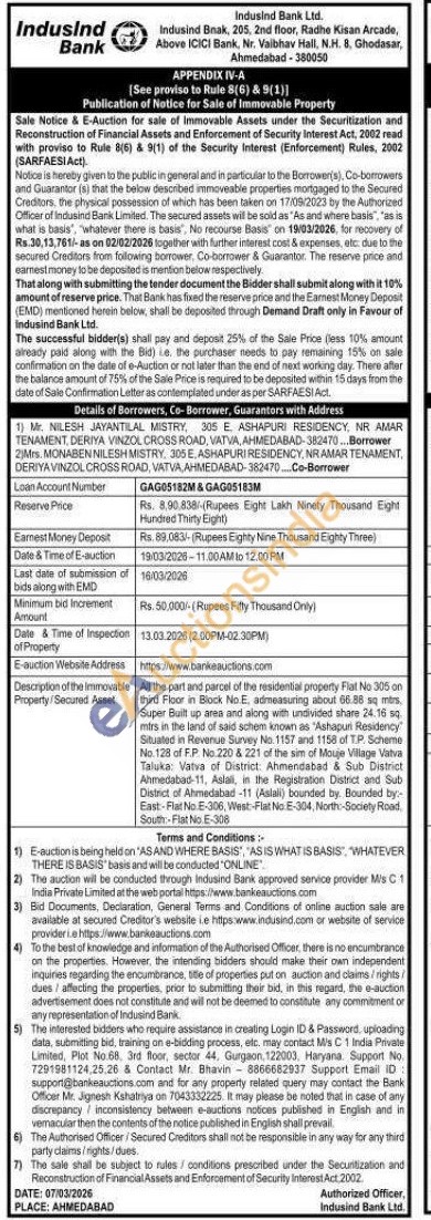 All the part and parcel of the residential property Flat No 305 on third Floor in Block No.E, admeasuring about 66.88 sq mers, Super Built up area and along with undivided share 24.16 sq. mtrs in the land of said schem known as "Ashapuri Residency Situated in Revenue Survey No. 1157 and 1158 of T.P. Scheme No.128 of F.P. No.220 & 221 of the sim of Mouje Village Vatva Taluka: Vatva of District: Ahmendabad & Sub District Ahmedabad-11, Aslall, in the Registration District and Sub District of Ahmedabad -11 (Aslali) bounded by. Bounded by:-East-Flat No.E-306, West-Flat No E-304, North-Society Road, South: Flat No E-308