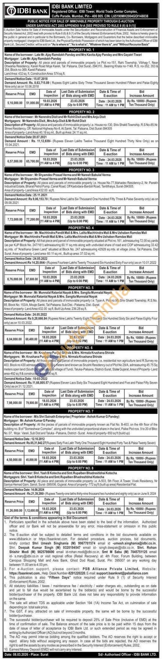 Description of Property: All piece and parcels of immovable property i.e. A-503, 5th Floor, A Tower, Vivek Residency, Nr Saniya Hemad Gam, Saroli, Surat-395006, Gujarat. Area of property-772 sq ft (built up area) Residential Flat.