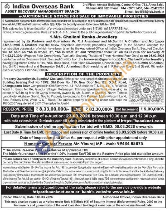 DESCRIPTION OF THE PROPERTY : (Property Owned by Mr. Sumthi A Challani) All the piece and parcel of site including House Building bearing Plot No 139/2, Old Door No. 115, New Door No. 129, G.S.T. Road, Chengalpattu Town Comprised in Old Survey No. 441/1A2 and New T. S. No. 441/1, Revenue Ward III, Block No 8A, Gundur Village, Melamayur, Thimmarajakulam, land measuring an extent of 12640 sq ft or 29 Cents presently owned by Mr. Sumthi A Challani. North: Temple Land/Hotel Akshaye Grand, South: Property belonging to Om Prakash Malani/Vacant Land, East: Railway Line, West: GST Road. The above property is covered under sale deed no 1070/2007 registered at SRO Chengalpattu Joint-I