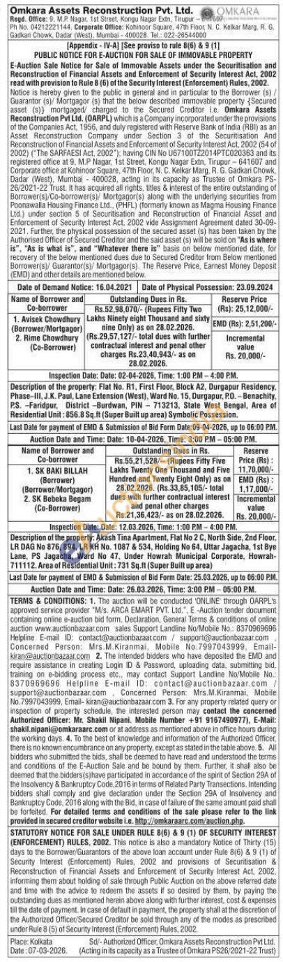 Description of the property: Flat No. R1, First Floor, Block A2, Durgapur Residency. Phase-III, J.K. Paul, Lane Extension (West), Ward No. 15, Durgapur, P.O. -Benachity, P.S. -Faridpur, District -Burdwan, PIN 713213, State West Bengal, Area of Residential Unit: 856.8 Sq.ft (Super Built up area) Symbolic Possession