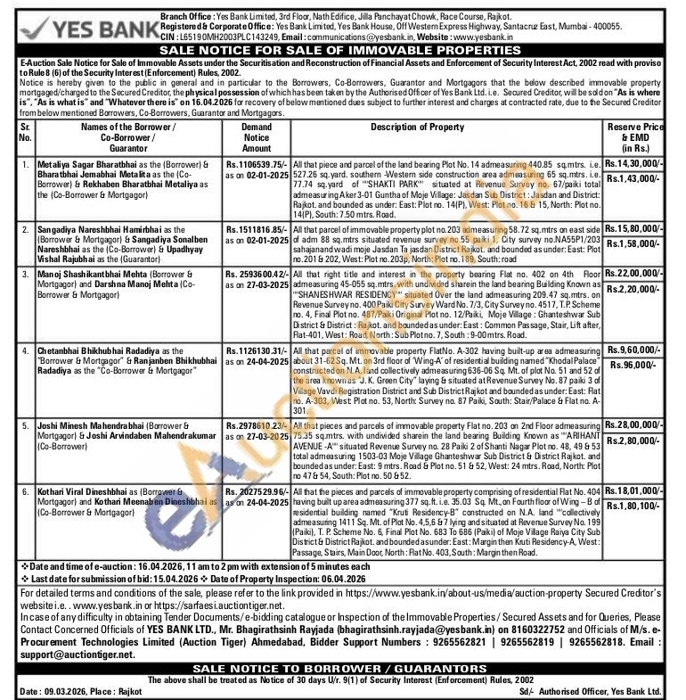 All that pieces and parcels of immovable property Flat no. 203 on 2nd Floor admeasuring 75.35 sq.mtrs. with undivided sharein the land bearing Building Known as "ARIHANT AVENUE-A situated Revenue Survey no. 28 Paiki 2 of Shanti Nagar Plot no. 48, 49 & 53 total admeasuring 1503-03 Moje Village Ghanteshwar Sub District & District Rajkot, and bounded as under: East: 9 mtrs. Road & Plot no. 51 & 52, West: 24 mtrs. Road, North: Plot no 47 & 54, South: Plot no. 50 &52.