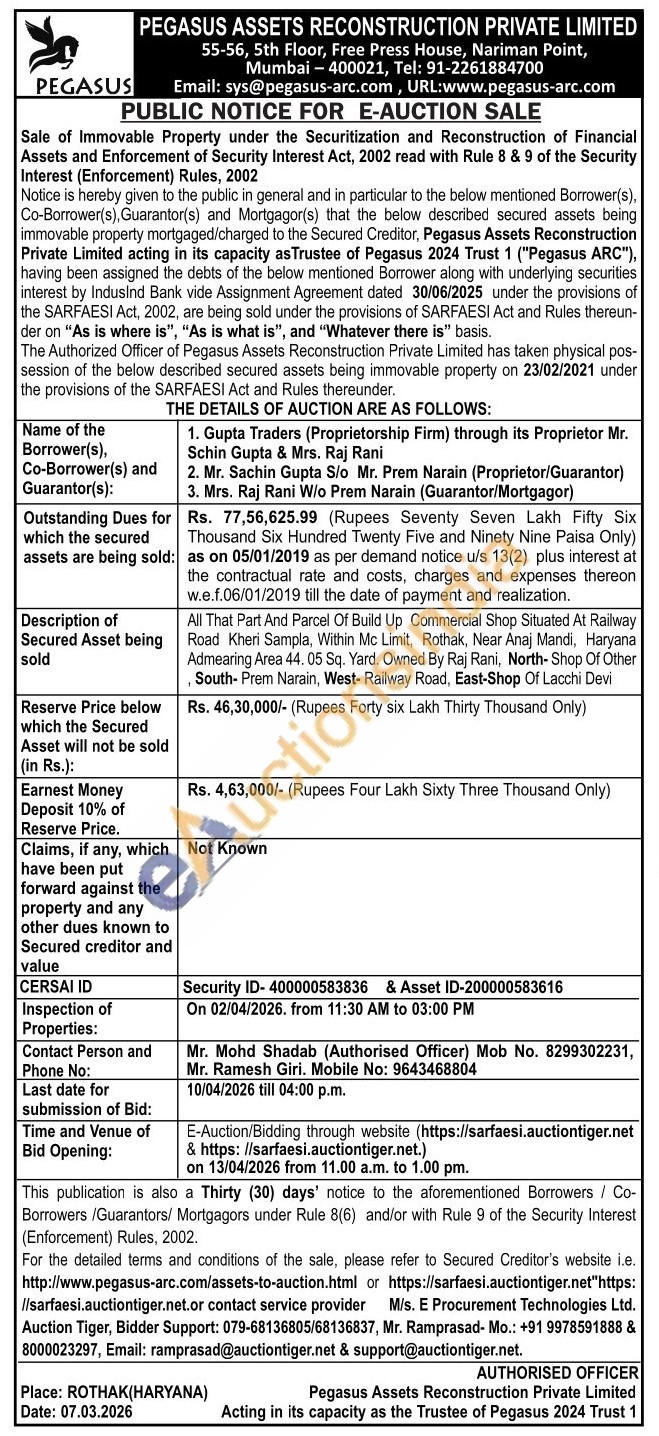 All That Part And Parcel Of Build Up Commercial Shop Situated At Railway Road Kheri Sampla, Within Mc Limit. Rothak, Near Anaj Mandi, Haryana Admearing Area 44. 05 Sq. Yard. Owned By Raj Rani, North-Shop Of Other South- Prem Narain, West- Railway Road, East-Shop Of Lacchi Devi