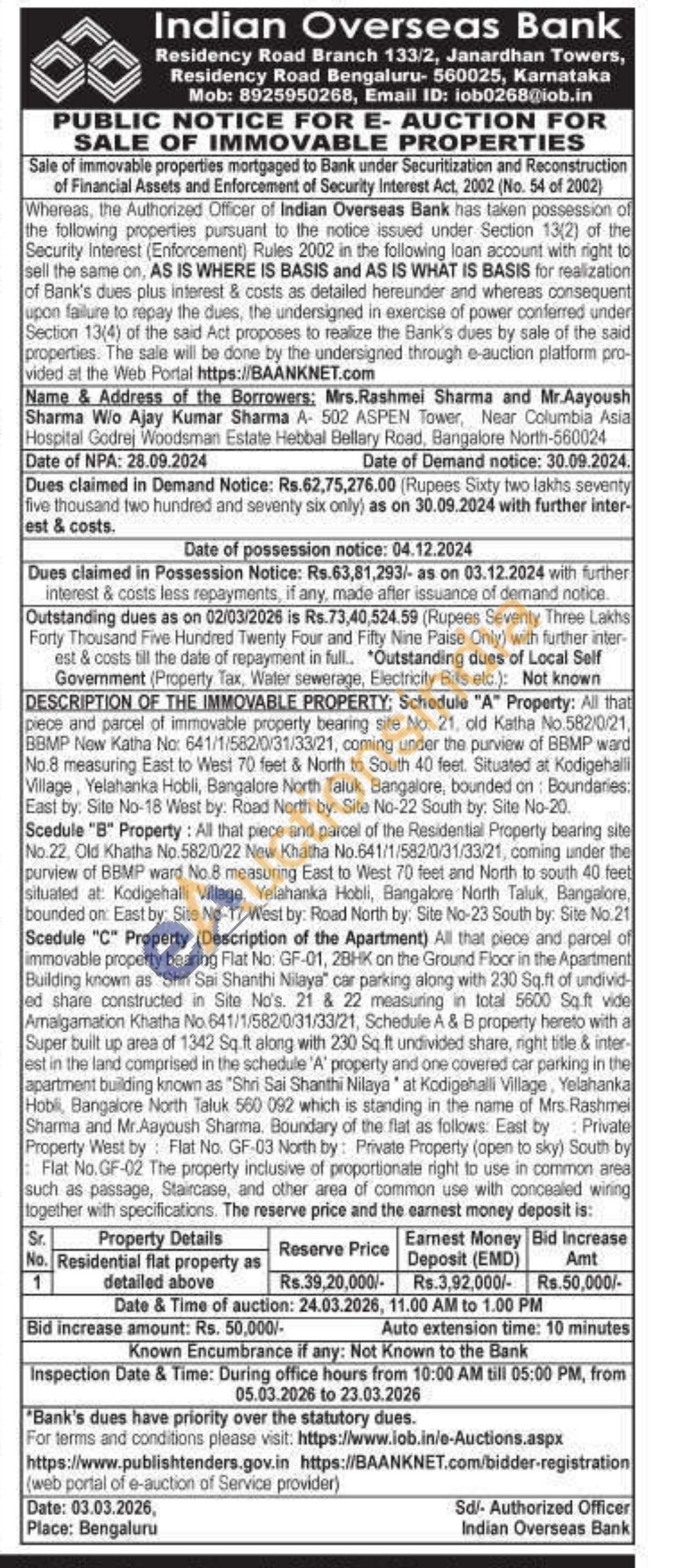 Scedule "C" Property (Description of the Apartment) All that piece and parcel of immovable property bearing Flat No: GF-01, 28HK on the Ground Floor in the Apartment Building known as "Shri Sai Shanthi Nilaya" car parking along with 230 Sq.ft of undivid ed share constructed in Site No's. 21 & 22 measuring in total 5600 Sq.ft vide Amalgamation Khatha No 641/1/582/0/31/33/21, Schedule A & B property hereto with a Super built up area of 1342 Sq ft along with 230 Sq. ft undivided share, right title & inter-est in the land comprised in the schedule 'A' property and one covered car parking in the apartment building known as "Shri Sai Shanthi Nilaya at Kodigehalli Village, Yelahanka Hobli, Bangalore North Taluk 560 092 which is standing in the name of Mrs. Rashmei Sharma and Mr.Aayoush Sharma. Boundary of the flat as follows. East by Private Property West by Flat No. GF-03 North by: Private Property (open to sky) South by Flat No. GF-02 The property inclusive of proportionate right to use in common area such as passage, Staircase, and other area of common use with concealed wiring together with specifications. The reserve price and the earnest money deposit is