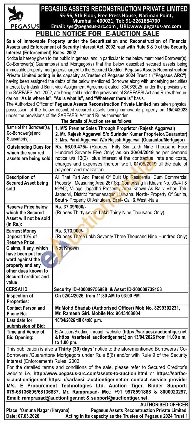 All That Part And Parcel Of Built Up Residential Cum Commercial Property Measuring Area 267 Sq. Comprising In Khasra No. 99//41 & 99//42, Village Jagadhri Presently Area Known As Rajiv Vihar, Teh. Jagadhri, District Yamunanagar, Haryana. North Property Of Sunita, South- Property Of Ashutosh, East- Gali & West-Nala