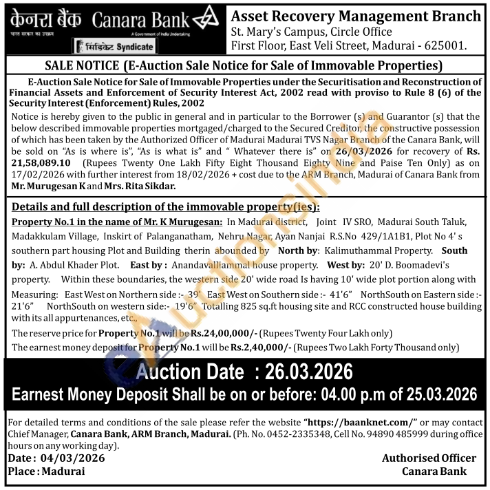 Property No.1 in the name of Mr. K Murugesan: In Madurai district, Joint IV SRO, Madurai South Taluk, Madakkulam Village, Inskirt of Palanganatham, Nehru Nagar, Ayan Nanjai R.S.No 429/1A1B1, Plot No 4' s southern part housing Plot and Building therin abounded by North by: Kalimuthammal Property. South by: A. Abdul Khader Plot. East by: Anandavalliammal house property. West by: 20' D. Boomadevi's property. Within these boundaries, the western side 20' wide road Is having 10' wide plot portion along with Measuring: East West on Northern side: 39' East West on Southern side: 41'6" NorthSouth on Eastern side:-21'6" NorthSouth on western side:- 19'6" Totalling 825 sq.ft housing site and RCC constructed house building with its all appurtenances, etc.,