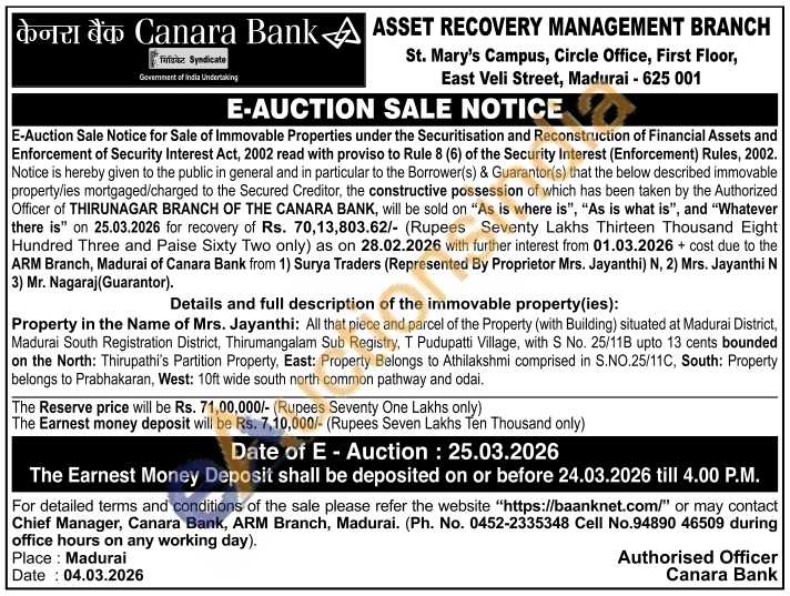Property in the Name of Mrs. Jayanthi: All that piece and parcel of the Property (with Building) situated at Madurai District, Madurai South Registration District, Thirumangalam Sub Registry, T Pudupatti Village, with S No. 25/11B upto 13 cents bounded on the North: Thirupathi's Partition Property, East: Property Belongs to Athilakshmi comprised in S.NO.25/11C, South: Property belongs to Prabhakaran, West: 10ft wide south north common pathway and odai