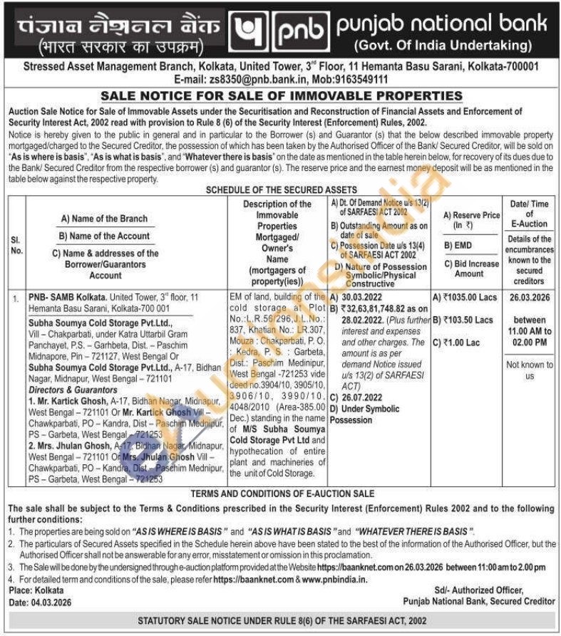 EM of land, building of the cold storage at Plot No.:L.R.56/296,J.L.No.: 837, Khatian No.: LR.307, Mouza: Chakparbati, P. O. Kedra, P. S. Garbeta, Dist.: Paschim Medinipur, West Bengal-721253 vide deed no.3904/10, 3905/10, 3906/10, 3990/10. 4048/2010 (Area-385.00 Dec.) standing in the name of M/S Subha Soumya Cold Storage Pvt Ltd and hypothecation of entire plant and machineries of the unit of Cold Storage