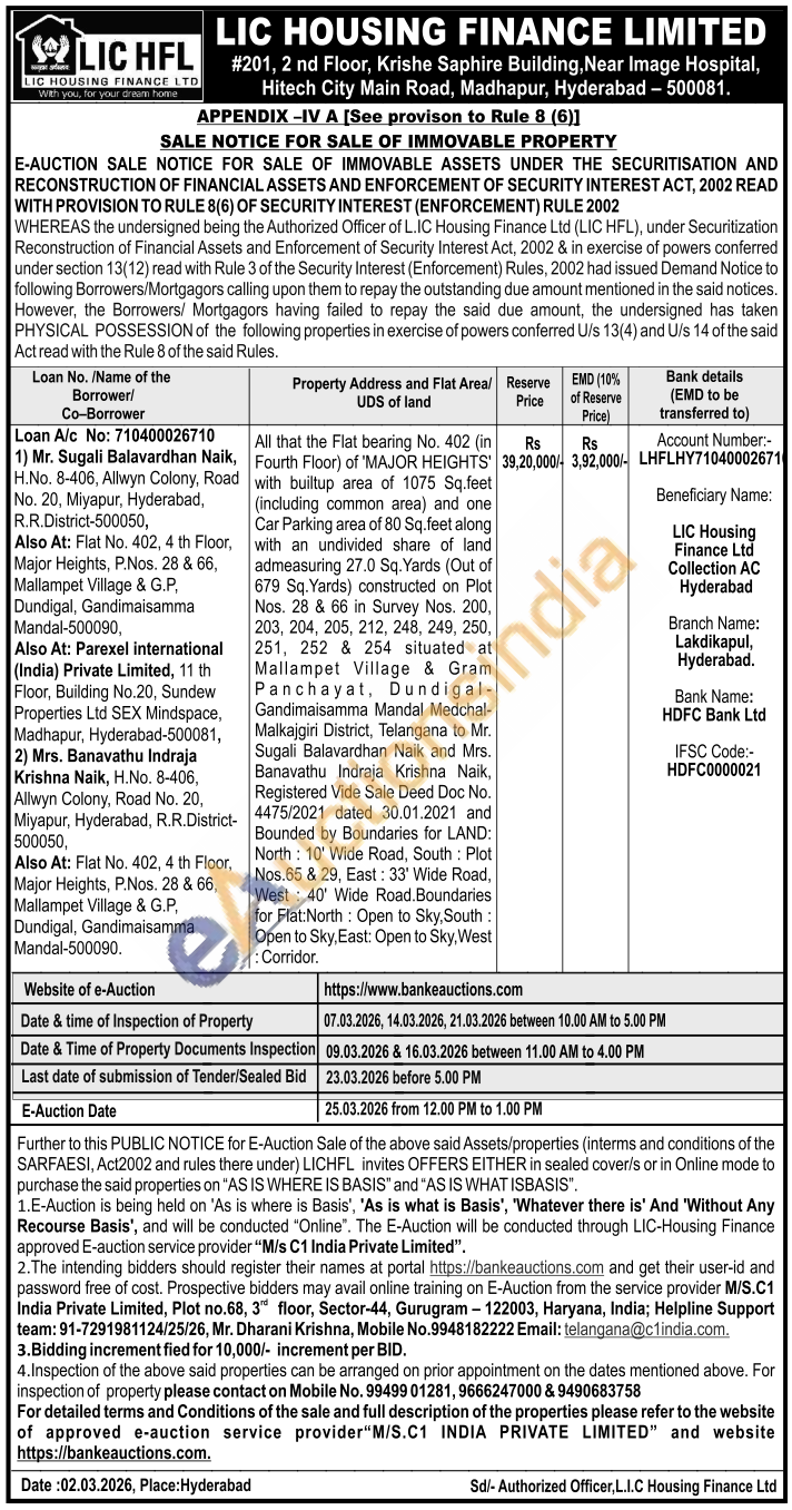 All that the Flat bearing No. 402 (in Fourth Floor) of 'MAJOR HEIGHTS with builtup area of 1075 Sq.feet (including common area) and one Car Parking area of 80 Sq. feet along with an undivided share of land admeasuring 27.0 Sq. Yards (Out of 679 Sq. Yards) constructed on Plot Nos. 28 & 66 in Survey Nos. 200, 203, 204, 205, 212, 248, 249, 250, 251, 252 & 254 situated at Mallampet Village & Gram Panchayat, Dundigal-Gandimaisamma Mandal Medchal-Malkajgiri District, Telangana to Mr. Sugali Balavardhan Naik and Mrs. Banavathu Indraja Krishna Naik, Registered Vide Sale Deed Doc No. 4475/2021 dated 30.01.2021 and Bounded by Boundaries for LAND: North: 10' Wide Road, South: Plot Nos.65 & 29, East: 33' Wide Road, West: 40 Wide Road Boundaries for Flat:North: Open to Sky, South: Open to Sky, East: Open to Sky, West Corridor.