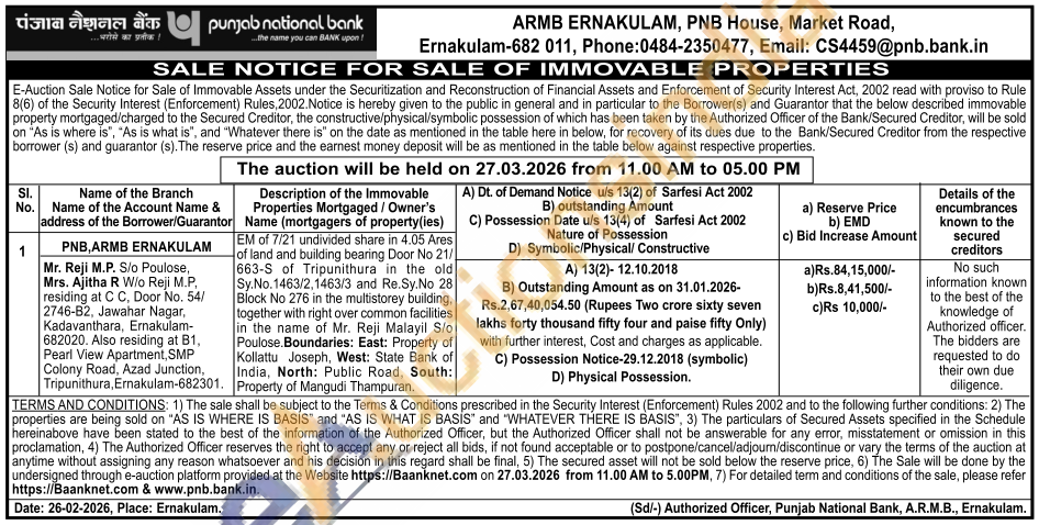 EM of 7/21 undivided share in 4.05 Ares of land and building bearing Door No 21/663-S of Tripunithura in the old Sy. No. 1463/2,1463/3 and Re.Sy.No 28 Block No 276 in the multistorey building, together with right over common facilities in the name of Mr. Reji Malayil S/o Poulose.Boundaries: East: Property of Kollattu Joseph, West: State Bank of India, North: Public Road, South: Property of Mangudi Thampuran