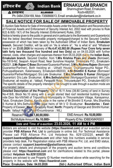 Detailed Description of the Property: EM of 16.11 Ares (39.80 Cents) of land in Survey No-418/8, Block No.10 along with a single storied tiled roof residential building thereon vide Door No-VIII/548 of Tripunithura Municipality in Thiruvankulam Village, Kanayannur, Taluk, Ernakulam District, Kerala state in the name of Mr.Shinthil S Kumar, Mrs. Shanthila S Kumar, & Mrs.Sethulakshmi, legal heirs of Mr.V D Sivakumar. Boundaries: East: Property of Easwer; West: Parappilly Road; North: Property of George and Shinthil Kumar; South: Vallayil Road. (Prior Encumbrance: NIL