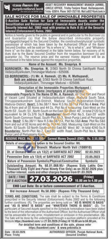 of Vacant Land Situated at Vedarpuliankulan village, Madurai South Taluk, Thirupparankundram Sub-District, Madurai South Registration-District, Madurai-District, Item1: S.No. 38/11 New R.S.No.38/11A Plot No.4 Area: Plot No.4 from and of 02 Acres and 44 Cs. Plot No.4 measuring East-West on the North 53, South: 53, North South on the East: 40 West: 40, In total 2120 Sq.ft equivalent to 04 Cs. 376 Sq.ft Boundaries: North-Plot No.5, East-20' width North South Common Road, South-Plat No.3, West-Punja Land of Periyarayar Kone. Item2: S.No.38/11 New R.S.No.38/11A, Plot No.586 Area: Plot No.586 from and out of 02 Acres and 44 Cs. Plot No.586. Measuring: East-West on the North: 53 South: 53 North South on the East:80° West: 80 in total 4240 Sq.ft Boundaries: North-Plot No.7, East-20 width Road, South-Plot No.4, West-Punja Land of Periyasamy Kone.