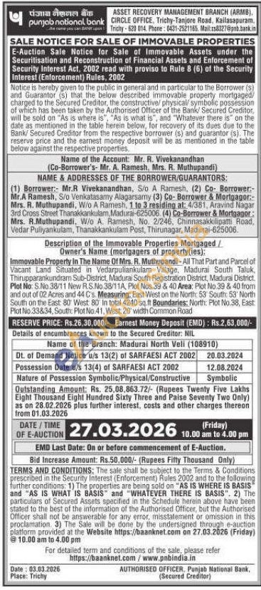 Immovable Property In The Name Of Mrs. R. Muthupandi - All That Part and Parcel of Vacant Land Situated in Vedarpuliankulam Village, Madurai South Taluk, Thirupparankundram Sub-District, Madurai South Registration District, Madura District. Plot No: S.No.38/11 New R.S.No.38/11A, Plot Nos.39 & 40 Area: Plot No.39 & 40 from and out of 02 Acres and 44 C's. Measuring: East West on the North 53 South: 53' North South on the East 80 West 80 In total 4240 sq.ft Boundaries: North: Plot No.38, East Plot No 33834, South Plot No.41, West: 20' width Common Road