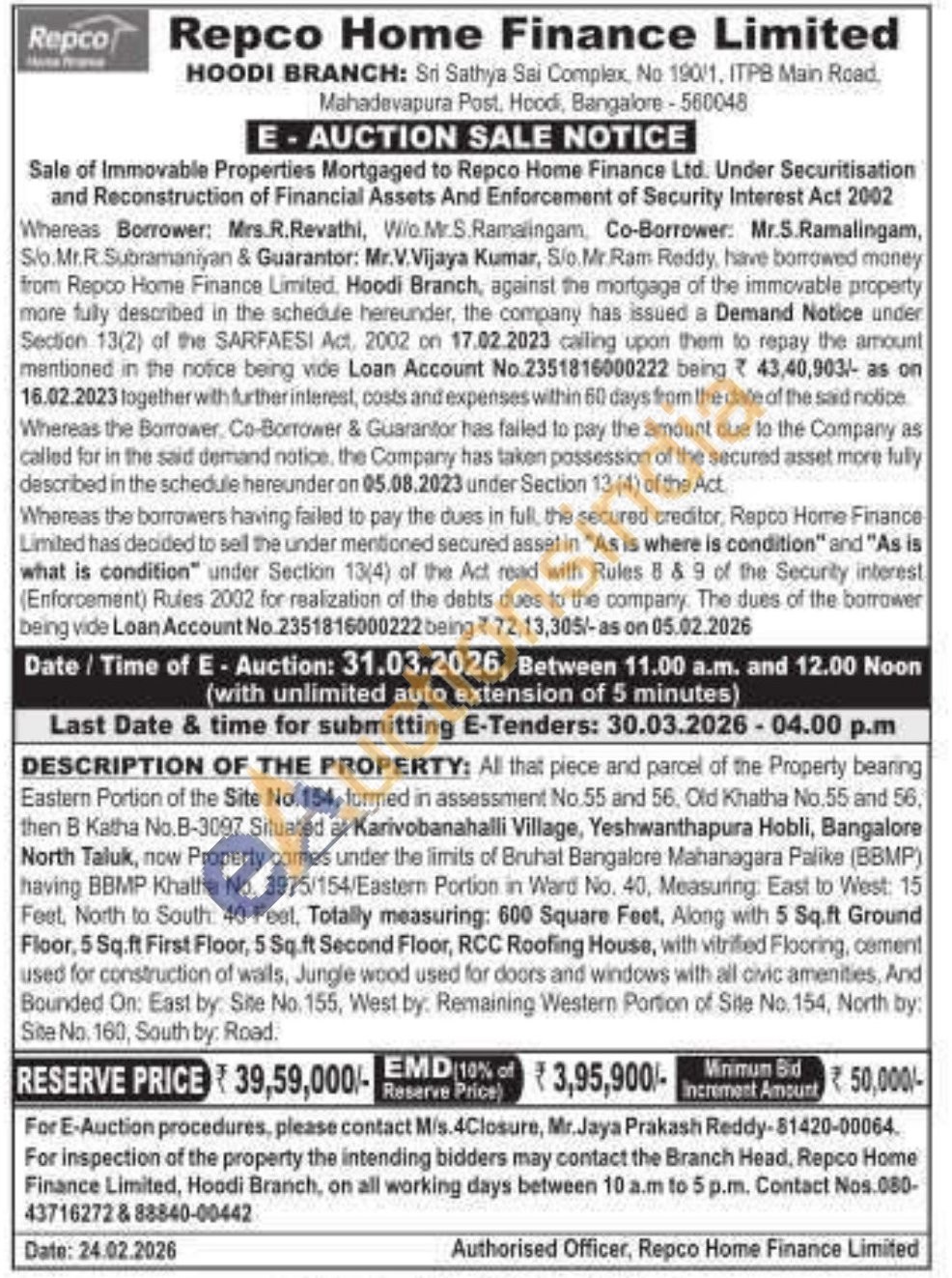 Eastern Portion of the Site No. 154, formed in assessment No.55 and 56. Old Khatha No.55 and 56. then B Katha No.B-3097 Situated at Karivobanahalli Village, Yeshwanthapura Hobli, Bangalore North Taluk, now Property comes under the limits of Bruhat Bangalore Mahanagara Palike (BBMP) having BBMP Khatha No. 3975/154/Eastern Portion in Ward No. 40, Measuring. East to West: 15 Feet, North to South. 40 Feet, Totally measuring: 600 Square Feet, Along with 5 Sq.ft Ground Floor, 5 Sq.ft First Floor, 5 Sq.ft Second Floor, RCC Roofing House, with vitrilled Flooring, cement used for construction of walls, Jungle wood used for doors and windows with all civic amenities, And Bounded On: East by: Site No. 155, West by: Remaining Western Portion of Site No. 154, North by: Site No. 160, South by: Road.