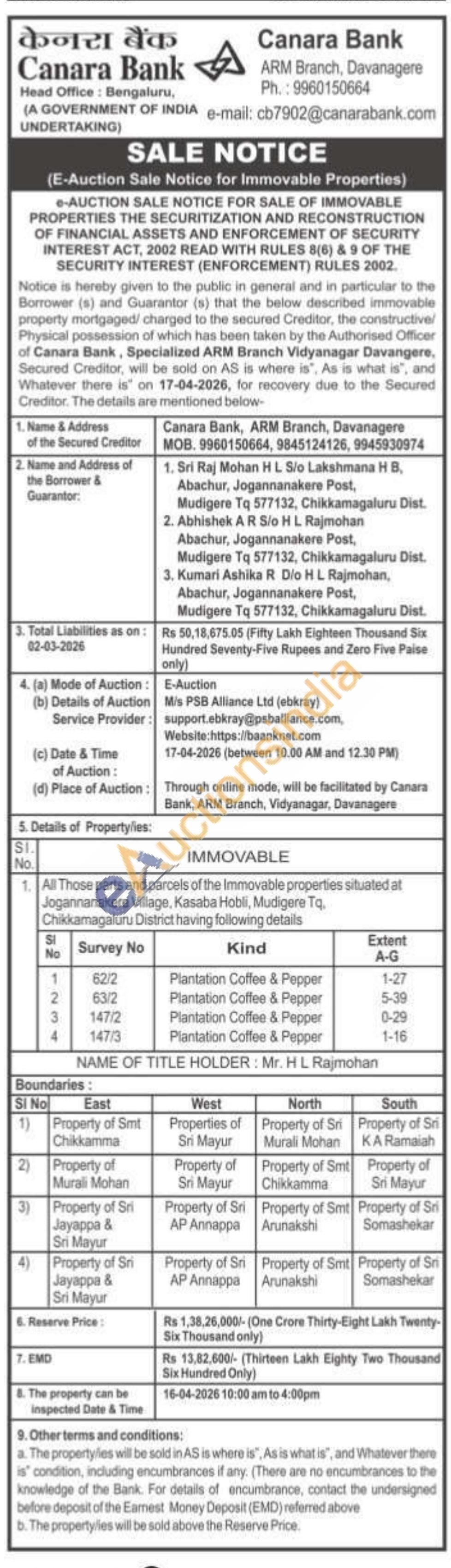 All Those parts and parcels of the Immovable properties situated at Jogannanakere Village, Kasaba Hobli, Mudigere Tq. Chikkamagaluru District
