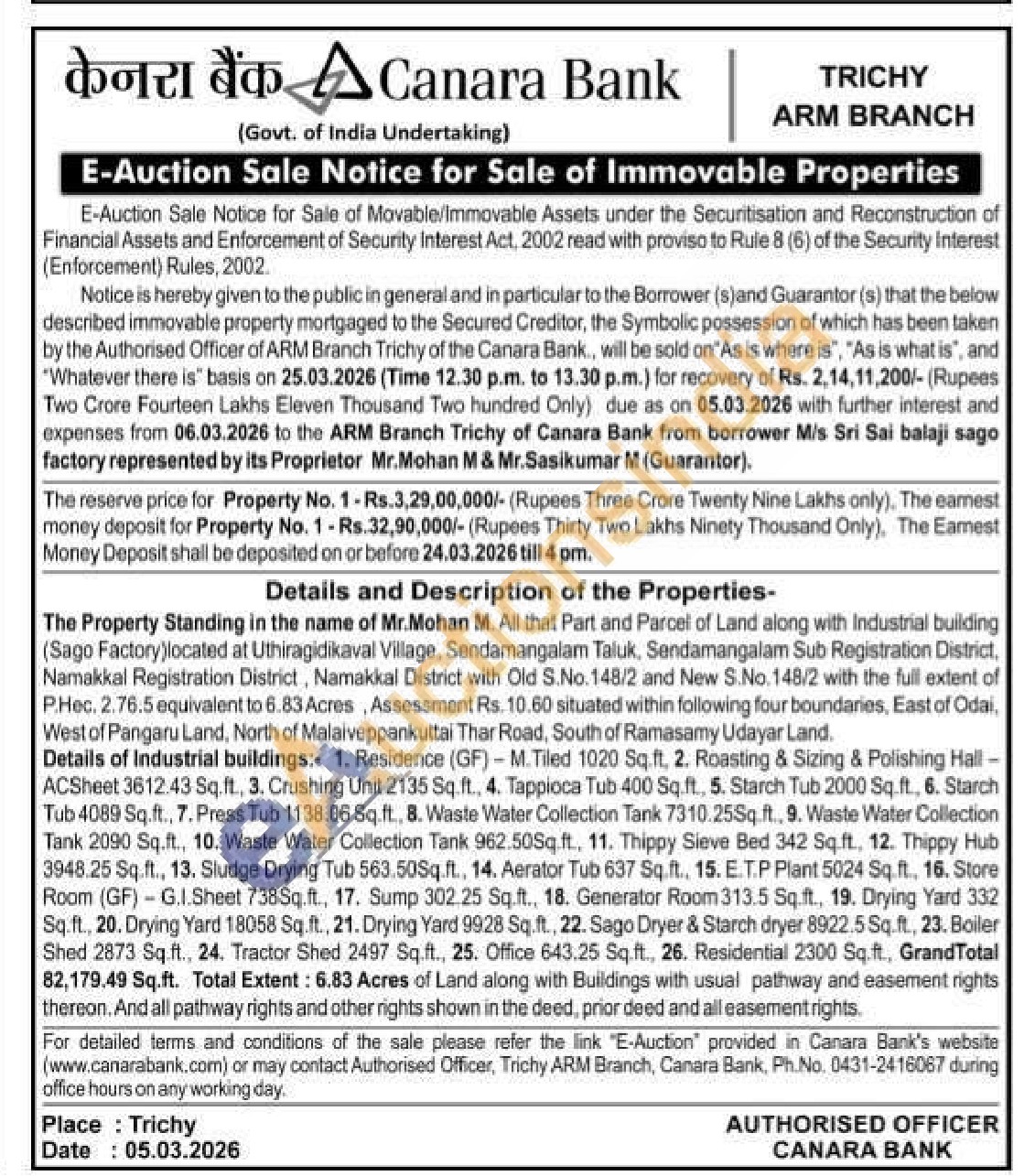 The Property Standing in the name of Mr.Mohan M. All that Part and Parcel of Land along with Industrial building (Sago Factory)located at Uthiragidikaval Village, Sendamangalam Taluk, Sendamangalam Sub Registration District, Namakkal Registration District, Namakkal District with Old S.No. 148/2 and New S.No. 148/2 with the full extent of P.Hec. 2.76.5 equivalent to 6.83 Acres, Assessment Rs. 10.60 situated within following four boundaries, East of Odai, West of Pangaru Land, North of Malaiveppankuttai Thar Road, South of Ramasamy Udayar Land. Details of Industrial buildings: 1. Residence (GF)-M.Tiled 1020 Sq.ft, 2. Roasting & Sizing & Polishing Hall -ACSheet 3612.43 Sq.ft., 3. Crushing Unit 2135 Sq.ft., 4. Tappioca Tub 400 Sq.ft., 5. Starch Tub 2000 Sq.ft., 6. Starch Tub 4089 Sq.ft., 7. Press Tub 1138.06 Sq.ft., 8. Waste Water Collection Tank 7310.25Sq. ft., 9. Waste Water Collection Tank 2090 Sq.ft., 10. Waste Water Collection Tank 962.50Sq.ft., 11. Thippy Sieve Bed 342 Sq.ft., 12. Thippy Hub 3948.25 Sq.ft., 13. Sludge Drying Tub 563.50Sq.ft., 14. Aerator Tub 637 Sq.ft., 15. E.T.P Plant 5024 Sq. ft., 16. Store Room (GF)G.I.Sheet 738Sq.ft., 17. Sump 302.25 Sq.ft., 18. Generator Room 313.5 Sq.ft., 19. Drying Yard 332 Sq.ft., 20. Drying Yard 18058 Sq.ft., 21. Drying Yard 9928 Sq.ft., 22. Sago Dryer & Starch dryer 8922.5 Sq.ft., 23. Boiler Shed 2873 Sq.ft., 24. Tractor Shed 2497 Sq.ft., 25. Office 643.25 Sq.ft., 26. Residential 2300 Sq.ft., Grand Total 82,179.49 Sq.ft. Total Extent: 6.83 Acres of Land along with Buildings with usual pathway and easement rights thereon. And all pathway rights and other rights shown in the deed, prior deed and all easement rights