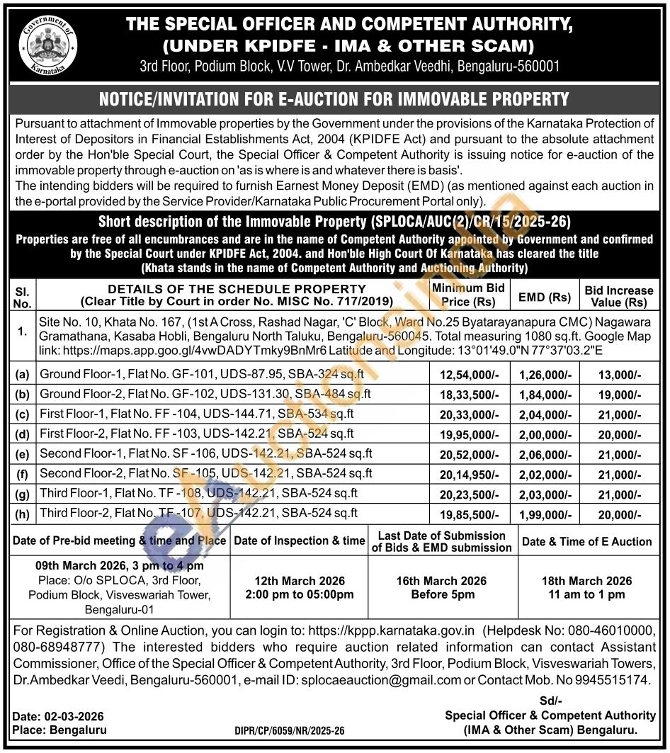 Site No. 10, Khata No. 167, (1st A Cross, Rashad Nagar, 'C' Block, Ward No.25 Byatarayanapura CMC) Nagawara Gramathana, Kasaba Hobli, Bengaluru North Taluku, Bengaluru-560045. Total measuring 1080 sq.ft. Google Map link: https://maps.app.goo.gl/4vwDADYTmky9BnMr6 Latitude and Longitude: 13°01'49.0″N 77°37'03.2"E (a) Ground Floor-1, Flat No. GF-101, UDS-87.95, SBA-324 sq.ft