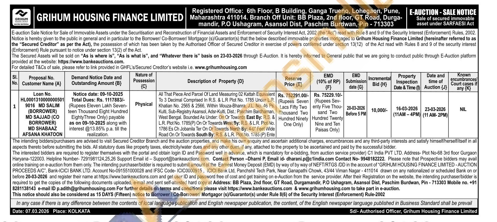 All That Piece And Parcel Of Land Measuring 02 Kattah Equivalent To 3 Decimal Comprised In R.S. & L.R Plot No. 1785 Under LR. Khatian No. 2565 & 2566, Within Mouza-Bhanra, J.L. No. 46 Ps. Kulti, Sub-Registry Asansol, Adsr-Kulti, Dist.: Paschim Bardhaman. West Bengal. Bounded As Under: On Or Towards East By: R.S. & L.R. Plot No. 1785(P) On Or Towards West By: R.S. & L.R. Plat No. 1786 Es Ch Jobanila Ter On Or Towards North By: 4-0 Feet Wide Road On Or Towards South By: R.S. & L.R. Plot No. 1785 (P) Ente