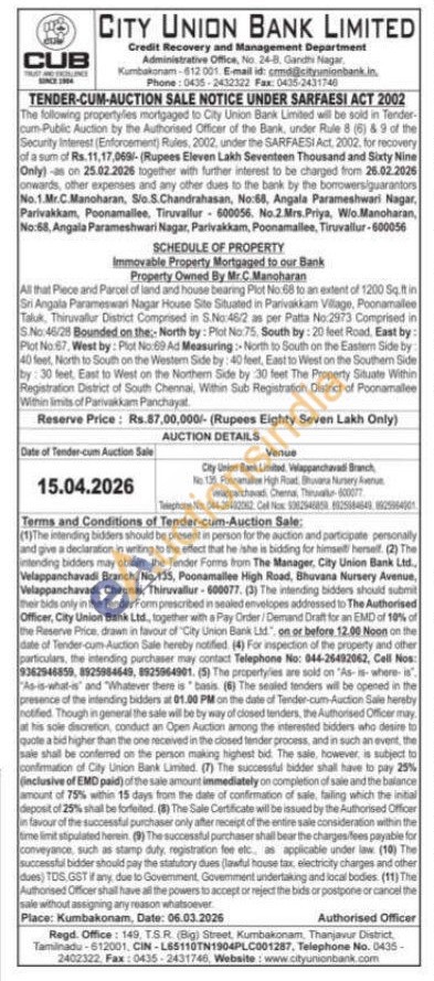 All that Piece and Parcel of land and house bearing Plot No.68 to an extent of 1200 Sq.ft in Sri Angala Parameswari Nagar House Site Situated in Parivakkam Village, Poonamallee Taluk, Thiruvallur District Comprised in S.No:46/2 as per Patta No:2973 Comprised in S.No: 46/28 Bounded on the North by: Plot No:75, South by: 20 feet Road, East by: Plot No:67, West by: Plot No:69 Ad Measuring: North to South on the Eastem Side by: 40 feet, North to South on the Western Side by: 40 feet, East to West on the Southern Side by: 30 feet, East to West on the Northern Side by 30 feet The Property Situate Within Registration District of South Chennai, Within Sub Registration District of Poonamallee Within limits of Parivakkam Panchayat.